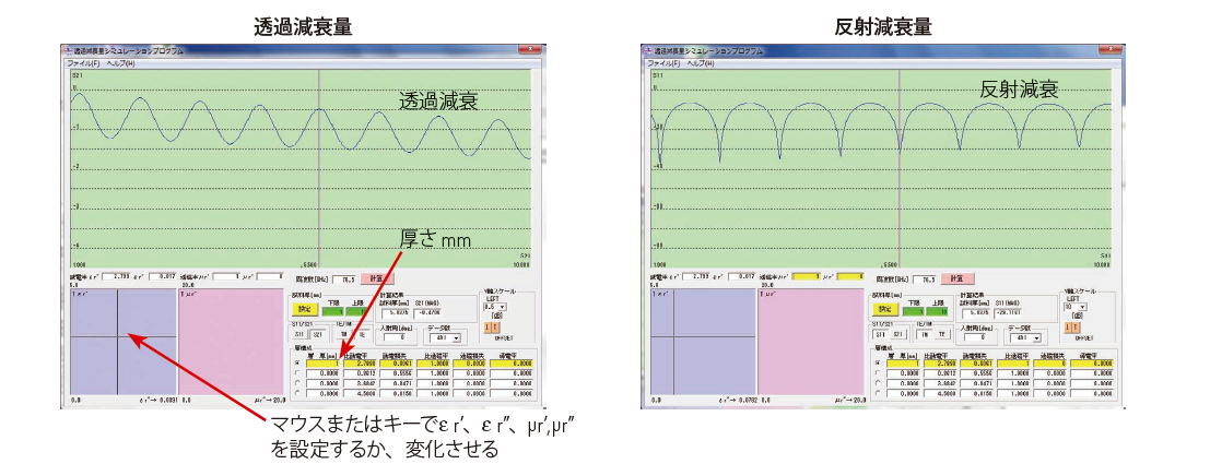 - ミリ波、マイクロ波における多層平板試料の透過減衰量および反射減衰量のシミュレーションを行うソフトウェアです。