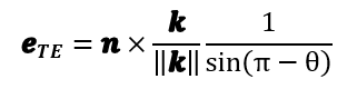 図2において、試料面(エンブレム面)の反射方向の法線ベクトルをnとし、電波の波数ベクトルをkとした場合に、外積n×k方向の単位方向ベクトルがETEiの単位方向ベクトルとなります。この単位ベクトルをeTEとすれば、法線ベクトルnと波数ベクトルkのなす角を(π-θ)としたときに、