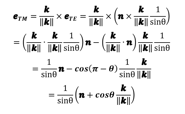 アンテナ上のETMi方向の単位ベクトルeTMは、kとeTEに垂直ですから、sin(π-θ)=sinθであることに注意して、